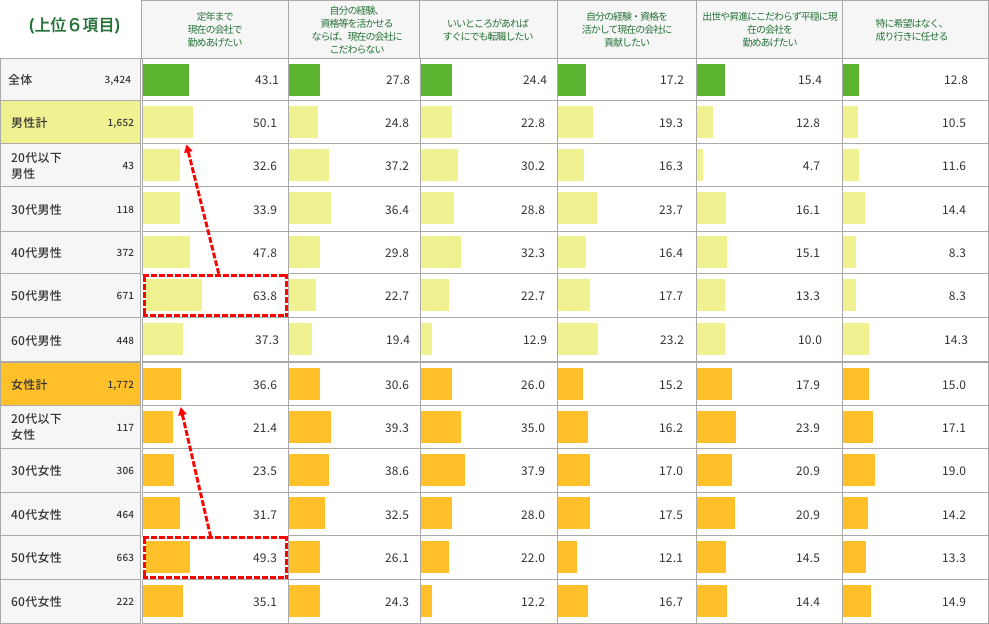 年代別では、男女共に60代以上が最も高く、年齢が下がるにつれて「定年まで現在の会社で勤めあげたい」と考えている人の割合が下がっています。